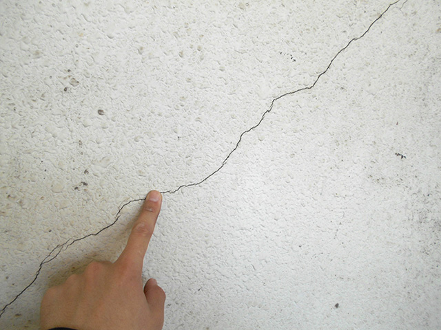 ひび割れは、経年劣化によって防水機能が低下した塗膜の表面で、雨水が吸収・乾燥を繰り返すことで発生します。